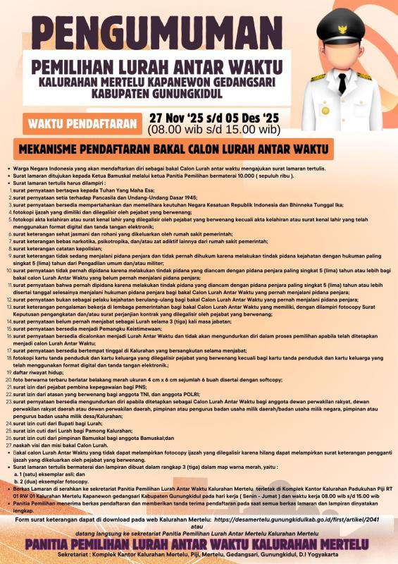 Mertelu_gedangsari. Sesuai yang tercantum dalam peraturan Tata Tertib Panitia Pemilihan Lurah Antar Waktu Kalurahan Mertelu Nomor 1 Tahun 2025, telah di mulai tahapan dalam pemilihan Lurah antar Waktu. Jadwal Tahapan Pemilihan dan Juga berkas berkas untuk kelengkapan administrasi dalam pendaftaran Pemilihan Lurah Antar Waktu dapat di lihat di lampiran.