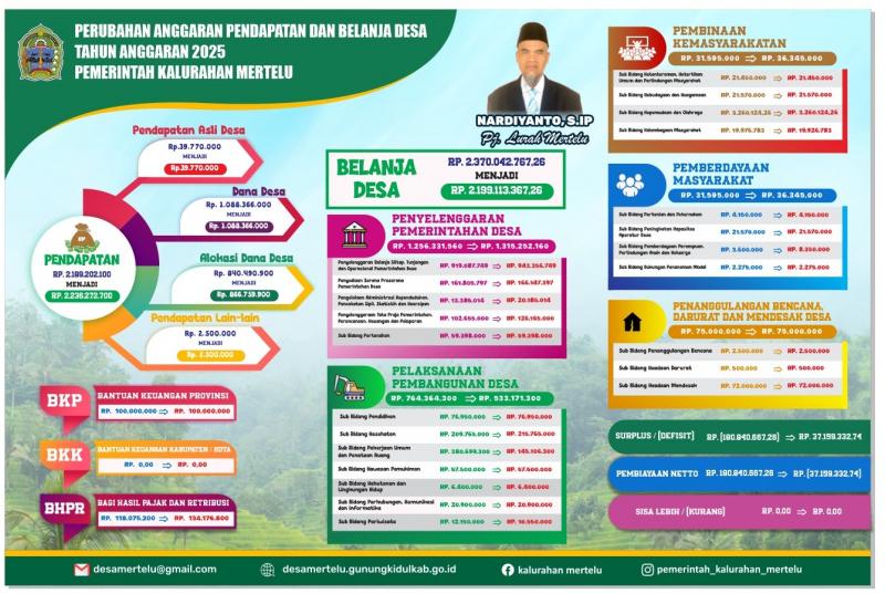 desamertelu.gununkidulkab.go.id - Dalam melaksanakan program Pemerintahan dan Pembangunan di Kalurahan Mertelu, Tahun 2025. Pemerintah Kalurahan Mertelu melakukan perubahan atas APBKal Tahun 2025. Yang mana perubahan tersebut dimaksudkan untuk melakukan penyesuaian terhadap APBKal Tahun 2025. Hal itu dilakukan dikarenakan terdapat program-program yang dinilai perlu dirubah atau disesuaikan.