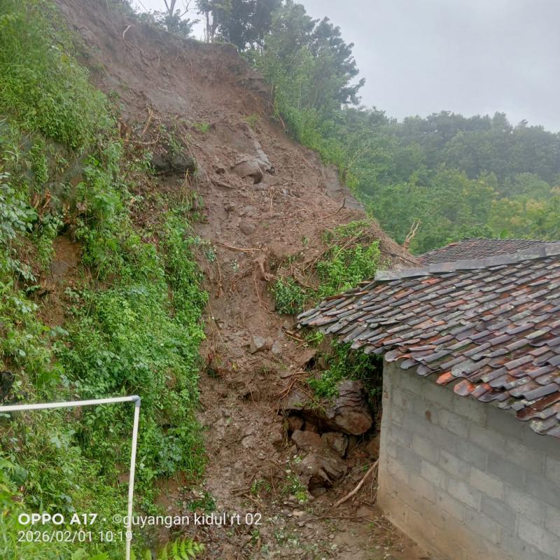 Hujan deras dengan durasi lama yang terjadi pada Sabtu siang hingga malam hari menyebabkan tebing yang berada di belakang rumah Bapak Lasiyat RT 03 RW 09 Padukuhan Guyangan Kidul longsor.Longsor ini terjadi pada Minggu dini hari sekitar pukul 03.00 WIB.