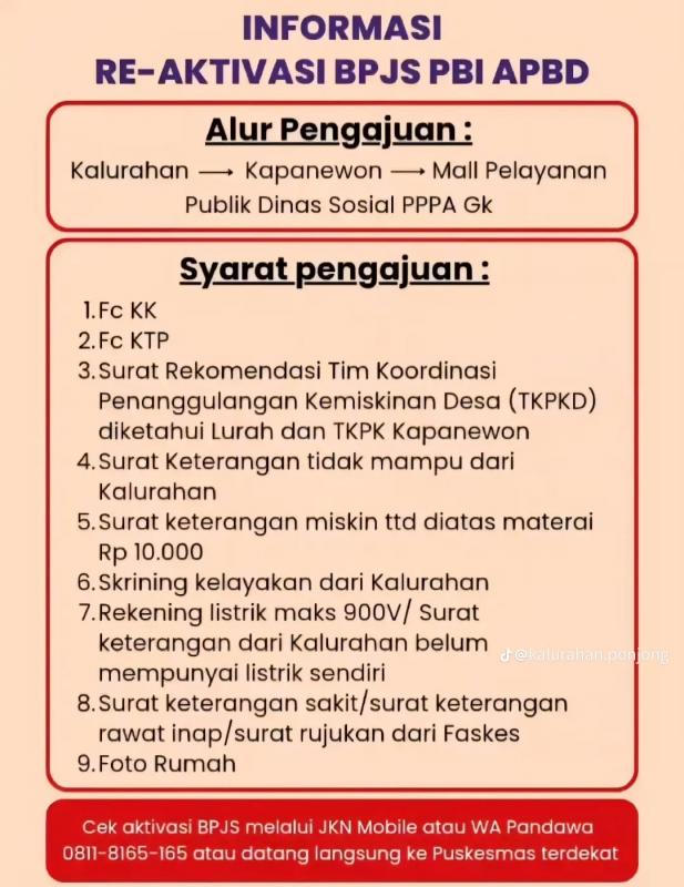 Reaktivasi BPJS Kesehatan PBI ini bisa dilakukan melalui alur pengajuan dari Kalurahan→Kapanewon→Mall Pelayanan Publik Dinas Sosial PPPA Kabupaten Gunungkidul dengan membawa persyaratan sebagai berikut: