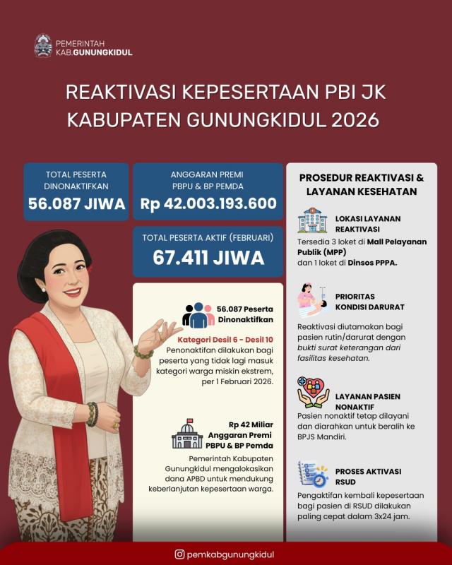 Pemerintah Kabupaten Gunungkidul melalui Dinas Sosial PPPA membuka layanan reaktivasi kepesertaan BPJS Kesehatan PBI di Mall Pelayanan Publik (MPP) bagi masyarakat yang status kepesertaannya dinonaktifkan. Kebijakan ini bertujuan untuk memastikan masyarakat yang memenuhi kriteria tetap memperoleh akses pelayanan kesehatan sesuai ketentuan yang berlaku.
