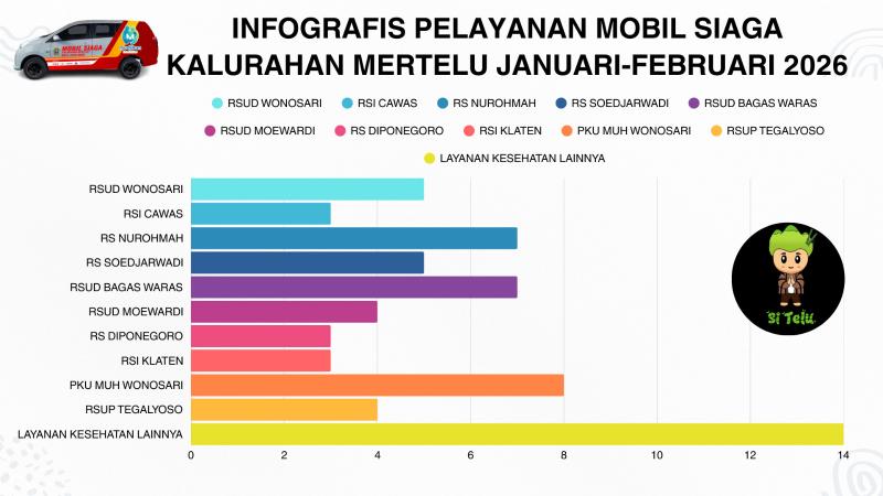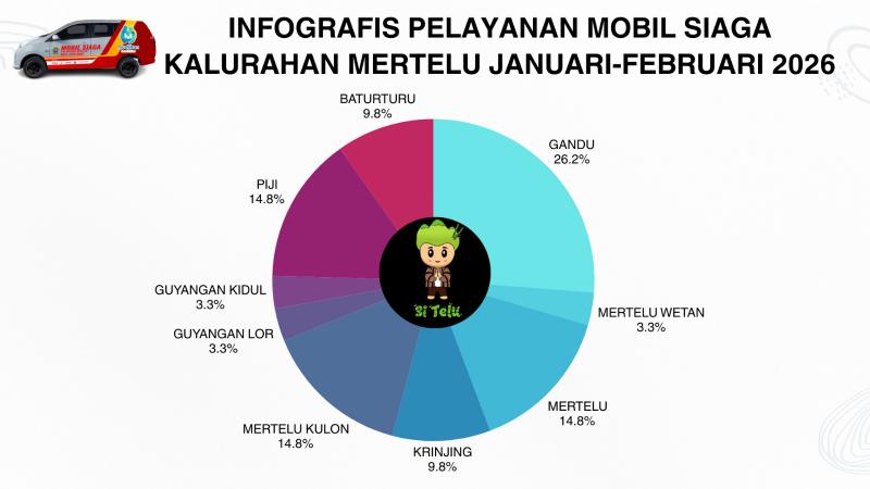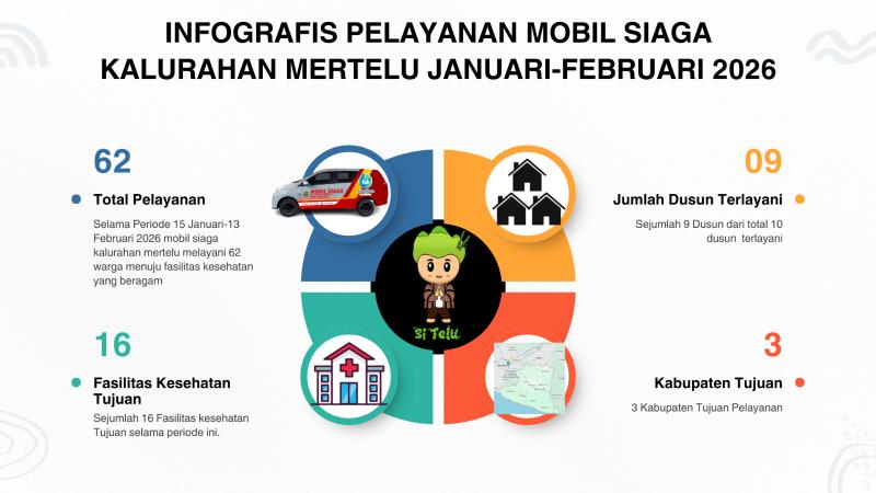 Berdasarkan infografis laporan pelayanan Mobil Siaga Kalurahan Mertelu periode 15 Januari hingga 13 Februari 2026, Mobil Siaga Kalurahan telah dimanfaatkan oleh 62 pengguna. Dari jumlah tersebut, Mobil Siaga Kalurahan diperuntukkan untuk pengantaran dan rujukan pasien ke 16 tujuan rumah sakit.