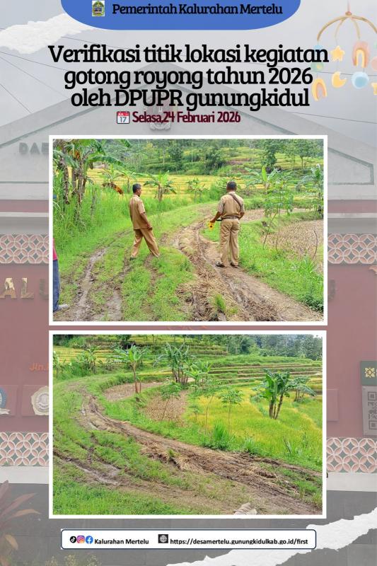 Mertelu,24 Februari 2026---------------- DPUPR Gunungkidul melakukan verifikasi titik lokasi kegiatan gotong royong tahun 2026 di Kalurahan Mertelu,yang berlokasi di Padukuhan Mertelu Wetan.Kegiatan verifikasi ini bertujuan untuk memastikan kesiapan lokasi, kondisi infrastruktur, serta kesesuaian rencana teknis sebelum pelaksanaan program gotong royong dimulai. Tim dari DPUPR melakukan pengecekan langsung di lapangan dengan meninjau akses jalan yang diusulkan melalui proposal kegiatan gotong royong tahun 2026.