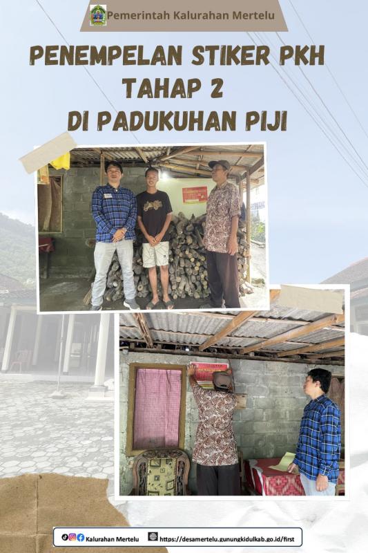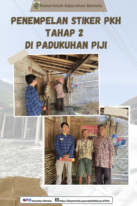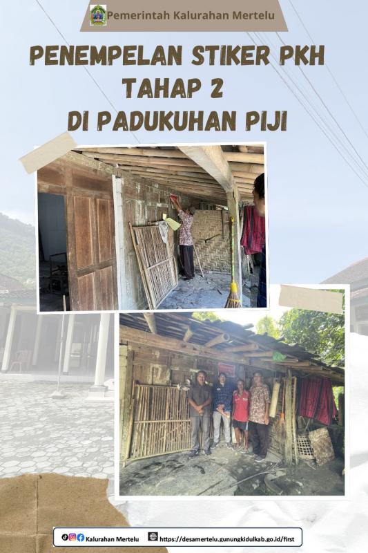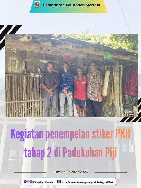 Piji-Mertelu,6 Maret 2026-------------Lurah Mertelu terjun langsung dalam kegiatan penempelan stiker tahap 2 bagi 5 (lima) Keluarga Penerima Manfaat (KPM) Program Keluarga Harapan (PKH) pada Jumat (6/3) di Padukuhan Piji,Kalurahan Mertelu. Kegiatan ini dilakukan Bersama Kamitua Mertelu beserta Dukuh Piji sebagai bentuk transparansi dan pendataan penerima bantuan sosial dari pemerintah.