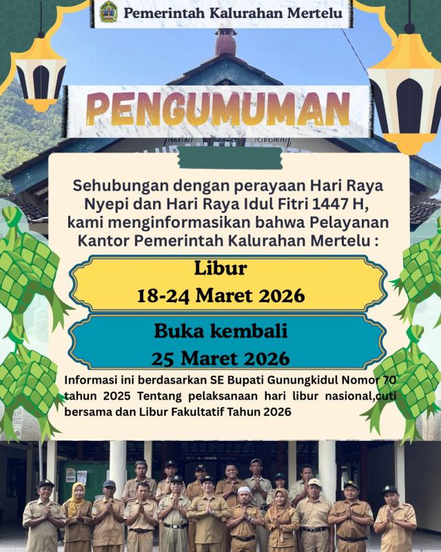 Sehubungan dengan peringatan Hari Raya Nyepi (Tahun Baru Saka 1948) dan Hari Raya Idul Fitri 1447 Hijriah, bersama ini kami sampaikan bahwa pelayanan di Kantor Kalurahan Mertelu :