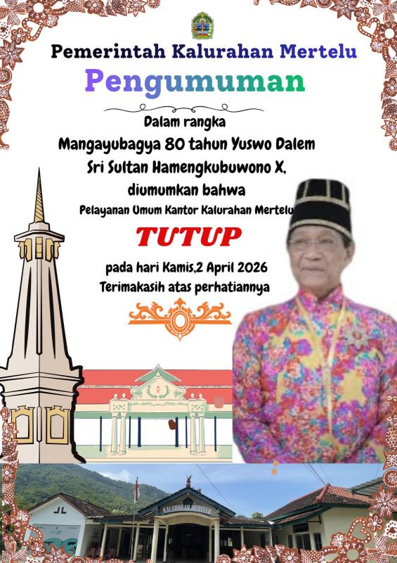 Kami informasikan bahwa pelayanan Kantor Kalurahan Mertelu pada Kamis, 2 April 2026 ditutup sementara karena mengikuti Kirab Mangayubagya 80 Tahun Yuswa Dalem Sri Sultan Hamengkubuwono X.