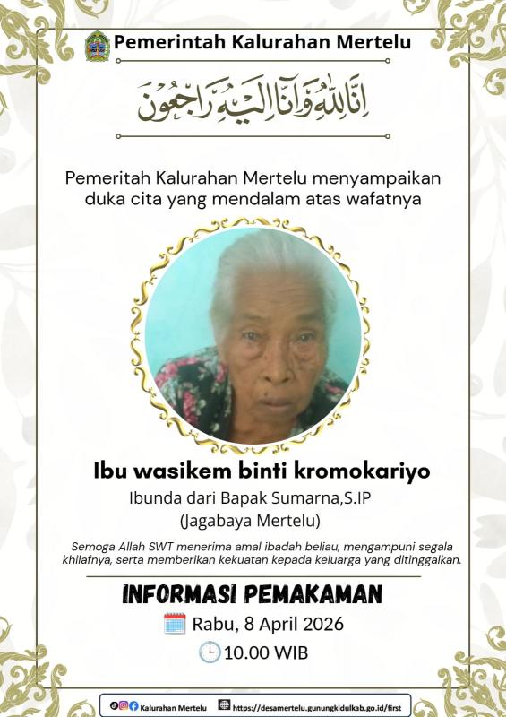 Pemerintah Kalurahan Mertelu turut berdukacita atas meninggalnya Ibu Wasikem yang merupakan Ibunda dari Bapak Sumarna,S.IP Jagabaya Mertelu.Semoga Almarhumah diterima semua amal ibadahnya oleh Allah SWT diampuni semua dosa-dosanya dan keluarga yang ditinggalkan diberikan kesabrah ketabahan dan keikhlasan.Amiiinnn