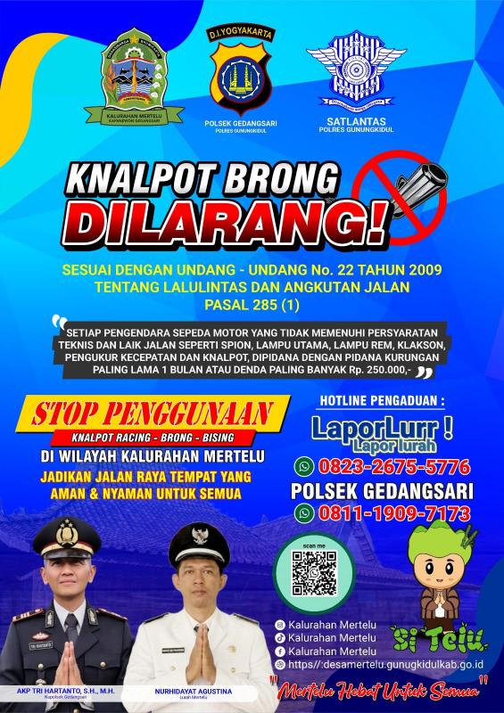 Sehubungan dengan upaya menjaga ketertiban dan kenyamanan masyarakat, dilarang menggunakan knalpot brong/racing/bising di wilayah Kalurahan Mertelu.