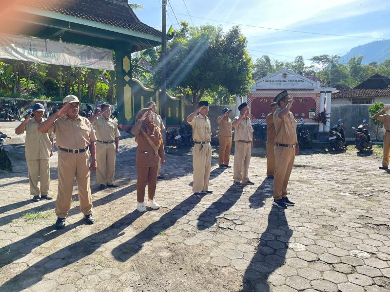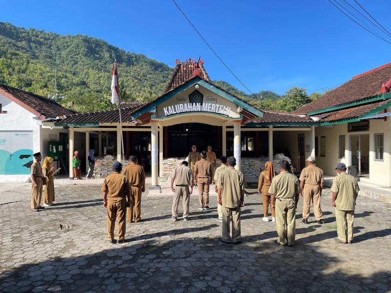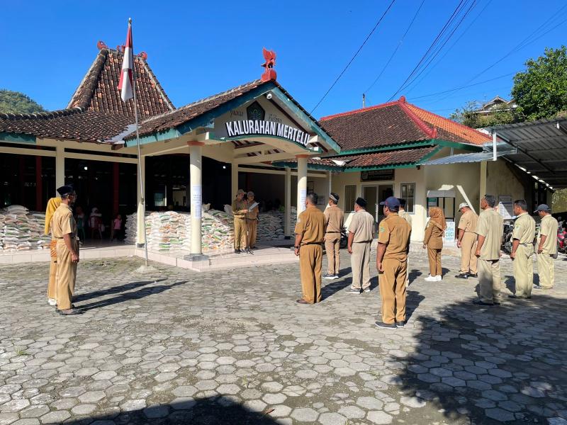 Mertelu---Apel kerja Pemerintah Kalurahan Mertelu yang dilaksanakan pada Senin, 13 April 2026, berlangsung dengan tertib dan khidmat di halaman kantor kalurahan Mertelu. Kegiatan tersebut dipimpin langsung oleh Lurah Mertelu yang dalam arahannya menekankan pentingnya kedisiplinan bagi seluruh pamong dalam menjalankan tugas dan tanggung jawab pelayanan kepada masyarakat. Selain itu, Lurah juga mengingatkan agar seluruh perangkat kalurahan senantiasa menjaga kekompakan dan kerja sama tim guna menciptakan kinerja yang efektif, harmonis, serta mampu memberikan pelayanan yang optimal kepada warga.