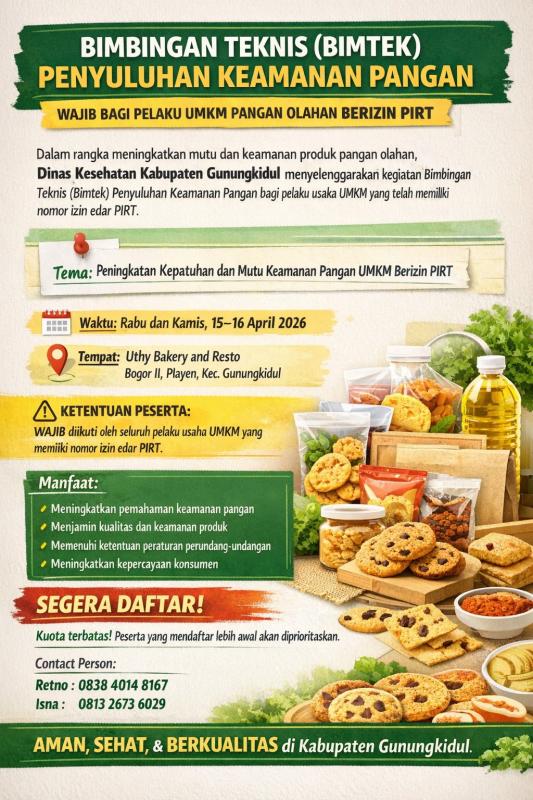 Diberitahukan kepada seluruh pelaku UMKM pangan olahan di Kalurahan Mertelu yang telah memiliki izin edar PIRT, bahwa Dinas Kesehatan Kabupaten Gunungkidul akan menyelenggarakan Bimtek Penyuluhan Keamanan Pangan.